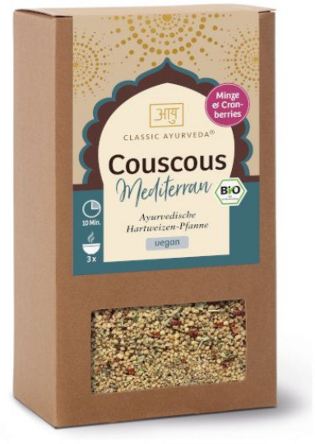 Ten śródziemnomorski kuskus jest wytwarzany z pełnoziarnistej semoliny z pszenicy durum i charakteryzuje się łagodnym smakiem. Przepis łączy owocową żurawinę, berberys i płatki granatu ze śródziemnomorską mieszanką ziół: tymiankiem, majerankiem, rozmarynem, bazylią i oregano. Specjały takie jak tulsi (bazylia indyjska) i szczypta asafetyda nadają mieszance wyjątkowy smak. Produkt jest przeznaczony do szybkiego przygotowywania pełnowartościowych posiłków i nadaje się do dań z patelni, jako nadzienie lub do sałatek.