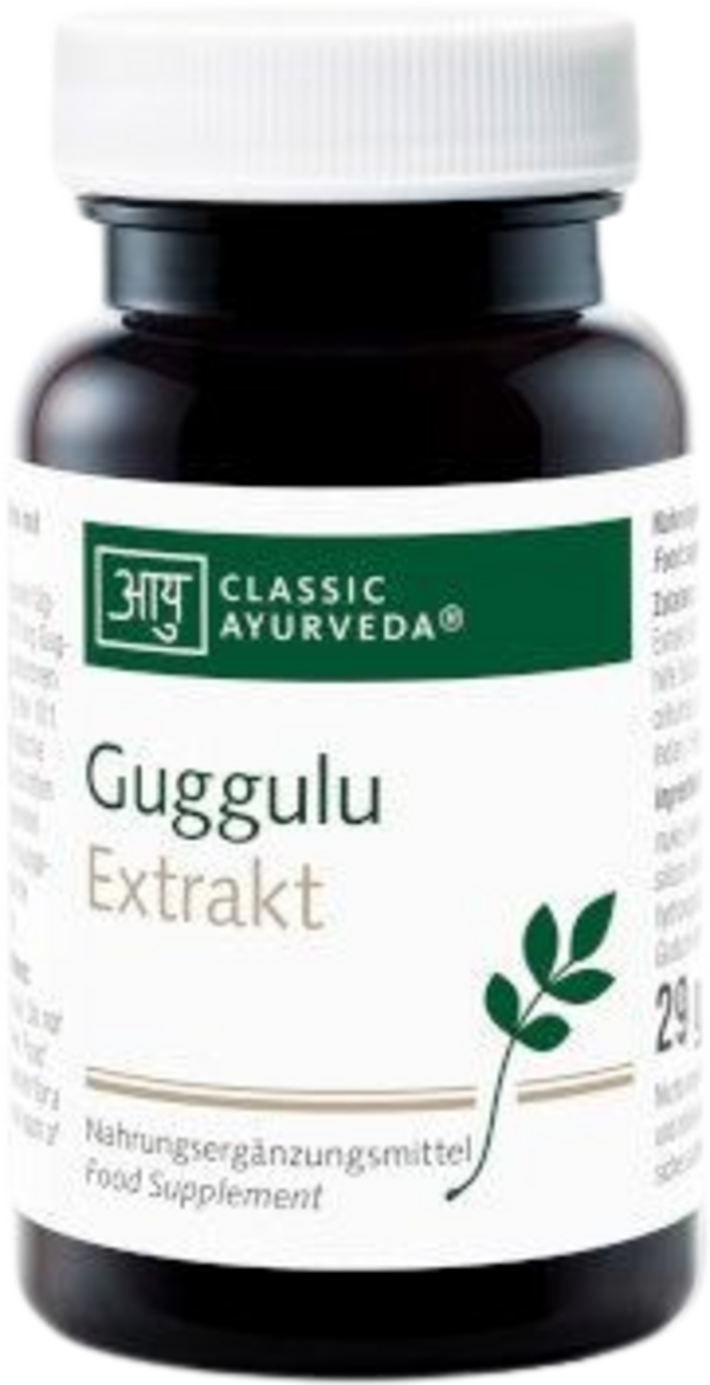 Ten produkt od Classic Ayurveda zawiera ekstrakt z guggulu (Commiphora mukul). Kapsułki dostarczają 570 mg ekstraktu roślinnego na dzienną dawkę, która zawiera 15 mg guggulsteronu. Stosunek ekstrakcji 10:1 zapewnia skoncentrowaną formę składników w otoczce kapsułki roślinnej wykonanej z hydroksypropylometylocelulozy.
