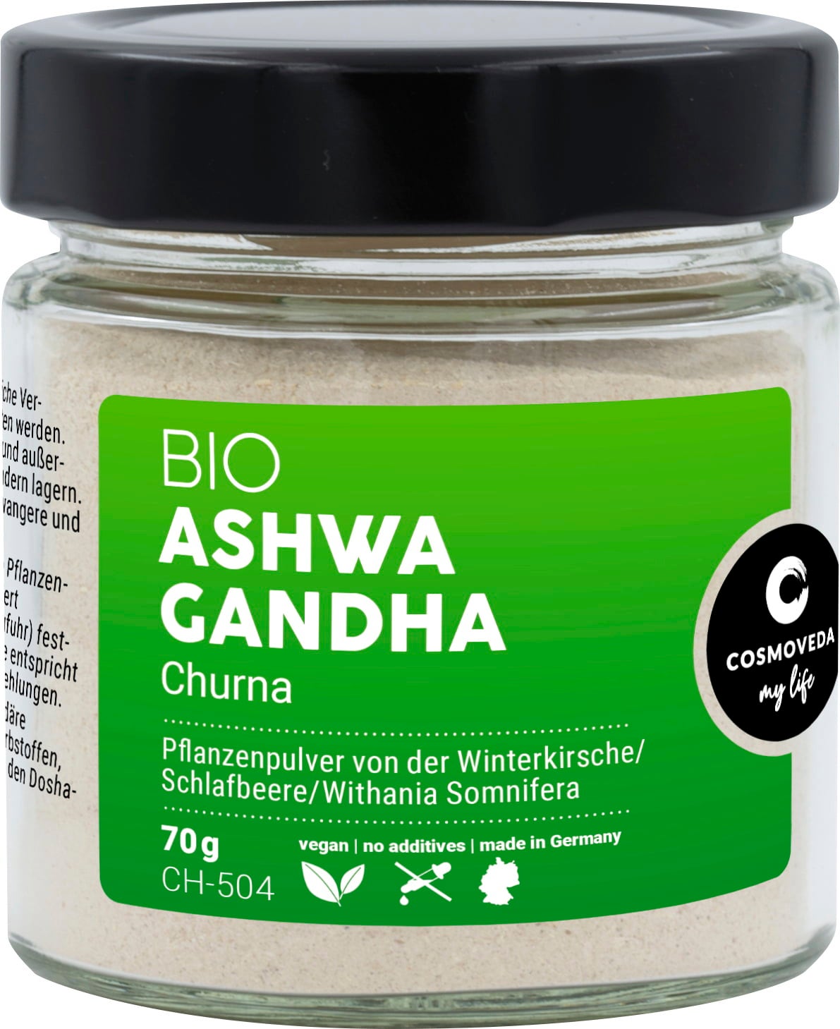 Ashwagandha - Whitania somnifera - to wiecznie zielona, krzaczkowata roślina o wysokości 0,5–1,5 m, o mięsistych korzeniach, prostych, zielonych, owalnych liściach i małych, kulistych, pomarańczowo-czerwonych jagodach, których korzenie są używane w żywieniu ajurwedyjskim. Drobno i delikatnie (poniżej 40 ° C) zmielony proszek suszonego korzenia pochodzi z indyjskiej i Sri Lanki, pochodzącej z targów COSMOVEDA oraz projektów ekologicznych.