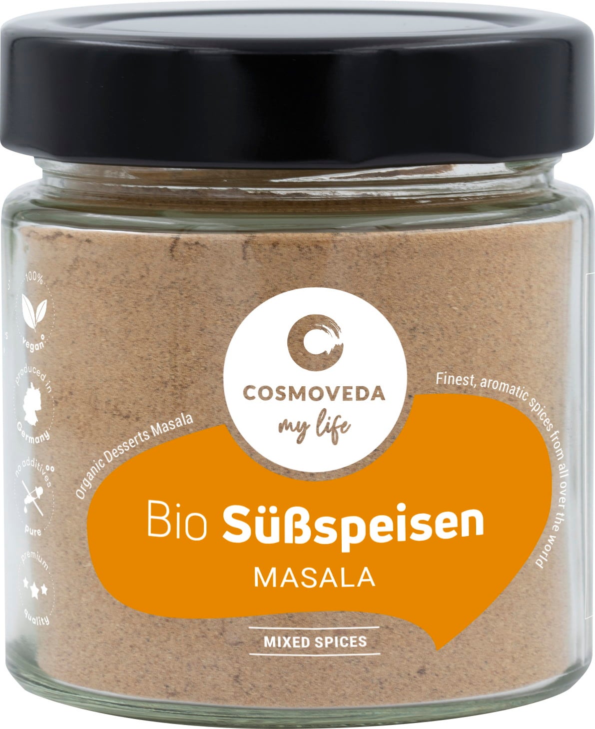 Desery Masala Cosmoveda wzbogaca desery, dania słodkie, ciasta i wypieki o lekko pikantny, pyszny aromat imbiru i kardamonu.