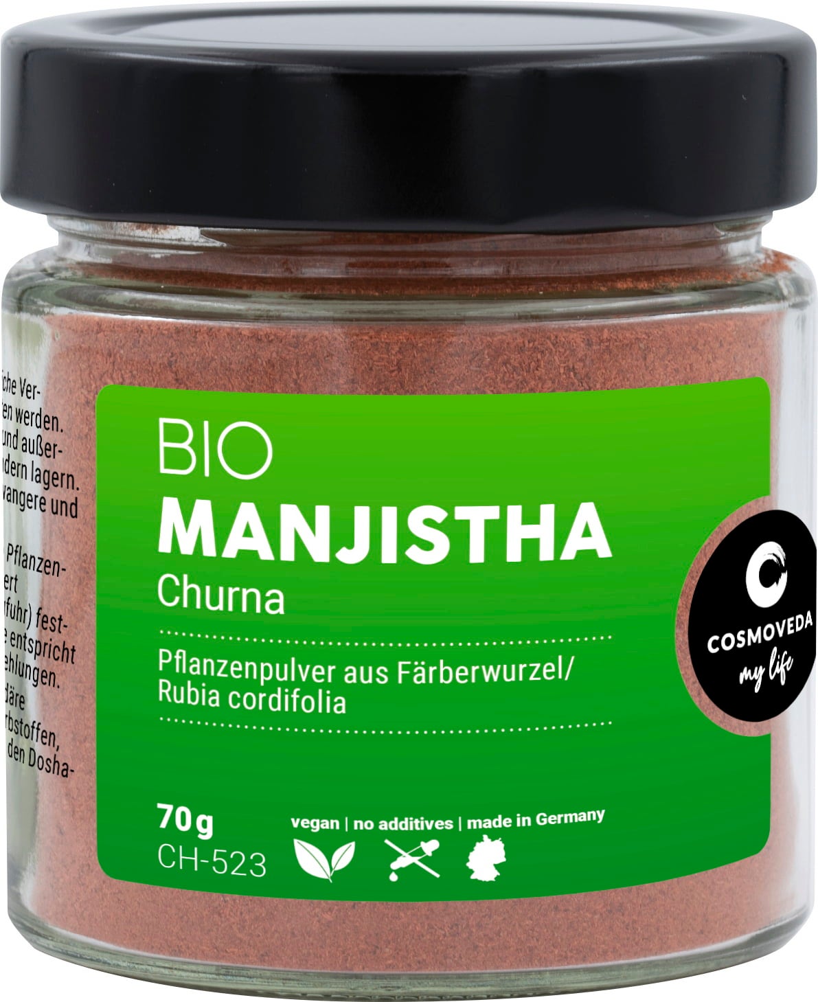 Manjistha - Rubia cordifolia - to wiecznie zielona roślina pnąca dorastająca do 1,5 m wysokości, z 5-10 cm długimi, nerkowatymi liśćmi, żółtawymi kwiatami i do 1,5 m długimi korzeniami, które są używane w żywieniu ajurwedyjskim.