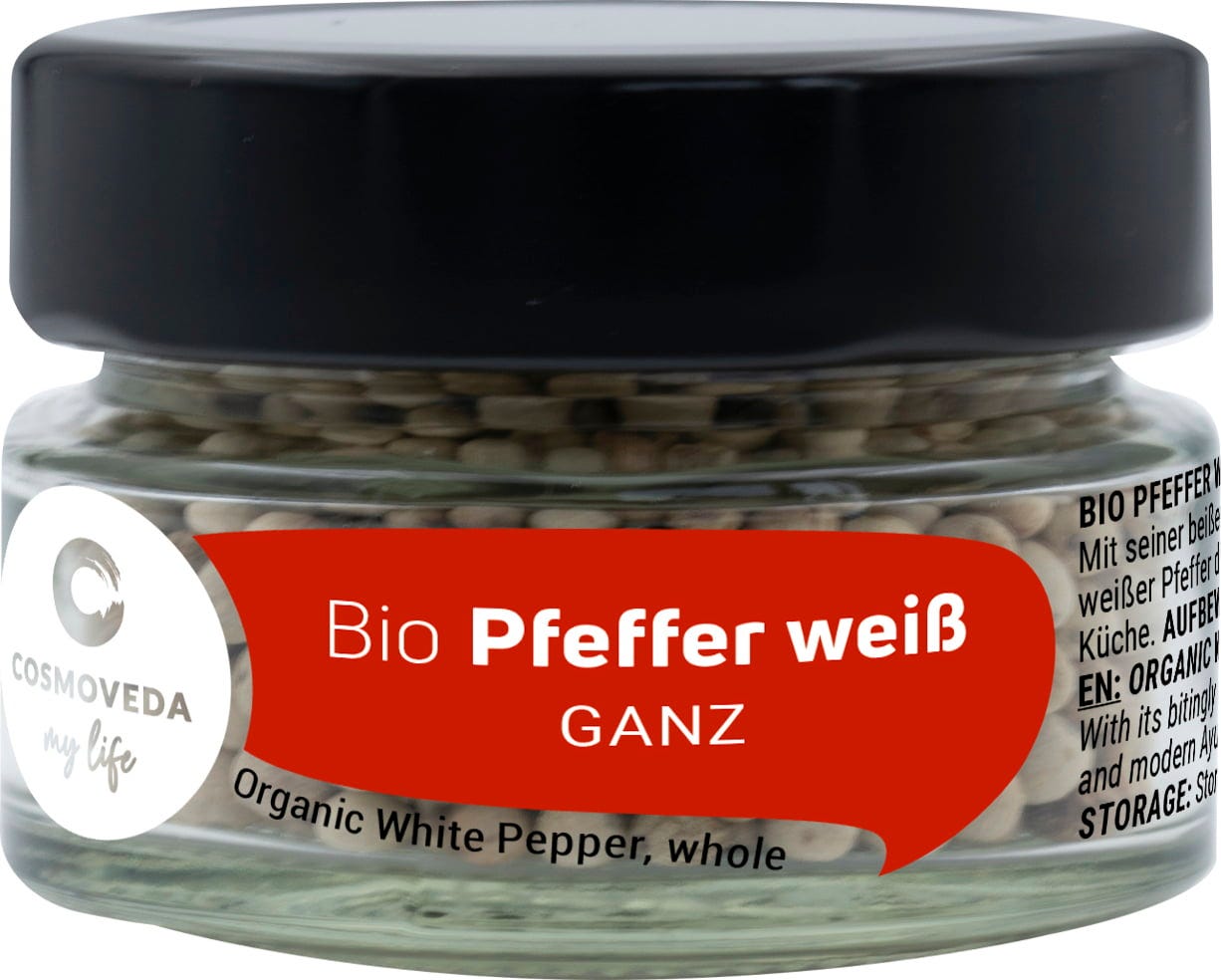 Biały pieprz jest cały i nie mielony. Biały pieprz jest szczególnie popularny ze względu na łagodniejszy, pikantny smak. Idealnie nadaje się do przyprawiania lekkich potraw, głównie do sosów, zup i sałatek.