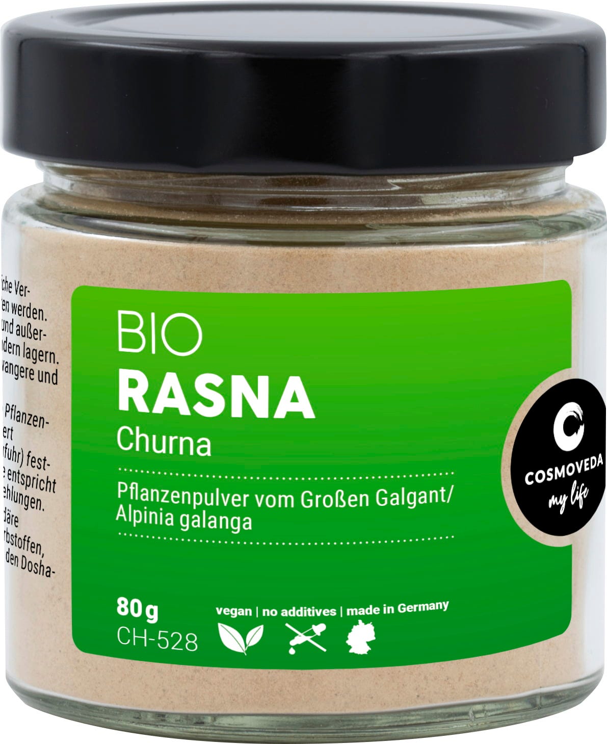Rasna - Alpinia galanga - to roślina znana pod nazwą Kaempferia galanga, dochodząca do 1,5 m wysokości, o biało-czerwonych kwiatach, których korzeń jest stosowany w żywieniu ajurwedyjskim. Proszek z suszonego korzenia, który jest drobno i delikatnie mielony (poniżej 40°C) w naszej produkcji, pochodzi z naszych projektów fair trade i bio w Indiach i na Sri Lance.