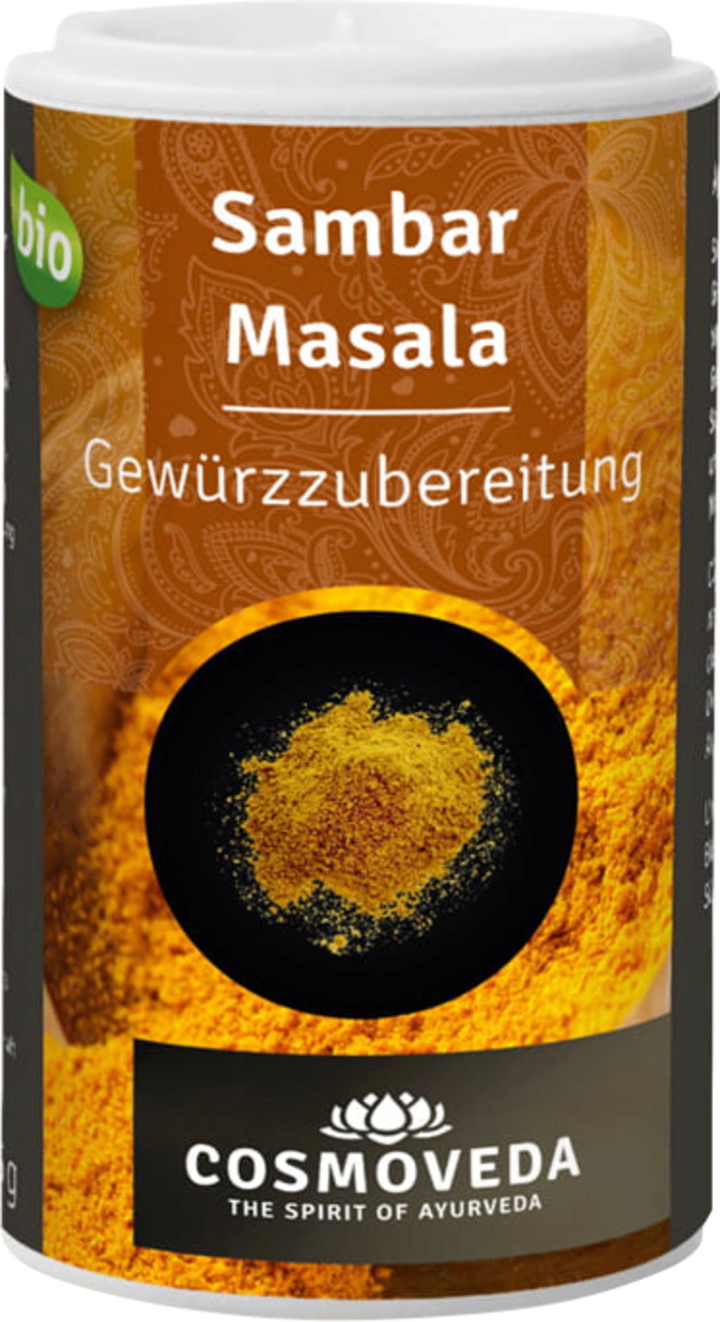Sambar Masala Bio COSMOVEDA, specjalnie dobrana ajurwedyjska mieszanka wykwintnych przypraw, która pomoże Ci stworzyć pyszną zupę sambar.