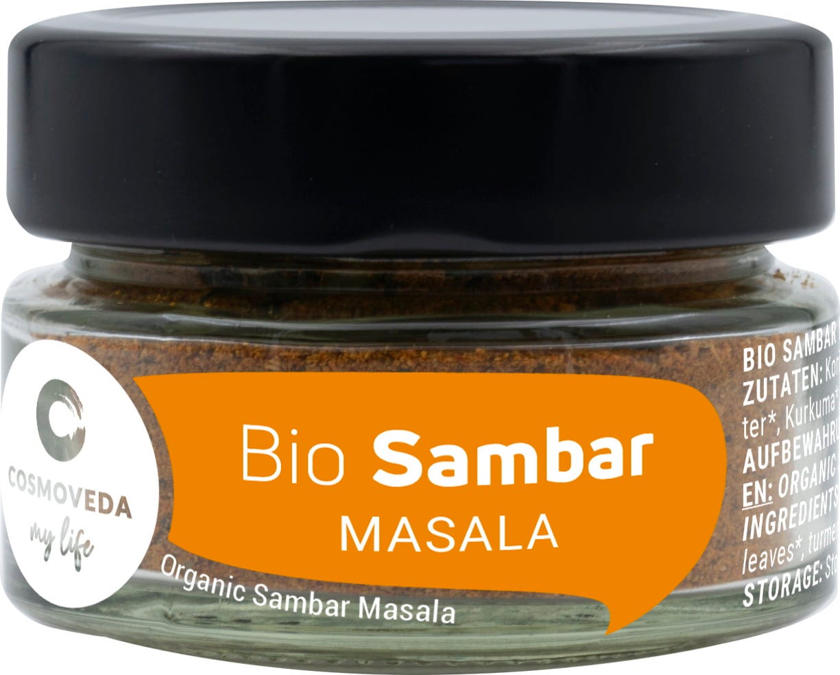 Sambar Masala Bio COSMOVEDA, specjalnie dobrana ajurwedyjska mieszanka wykwintnych przypraw, która pomoże Ci stworzyć pyszną zupę sambar.