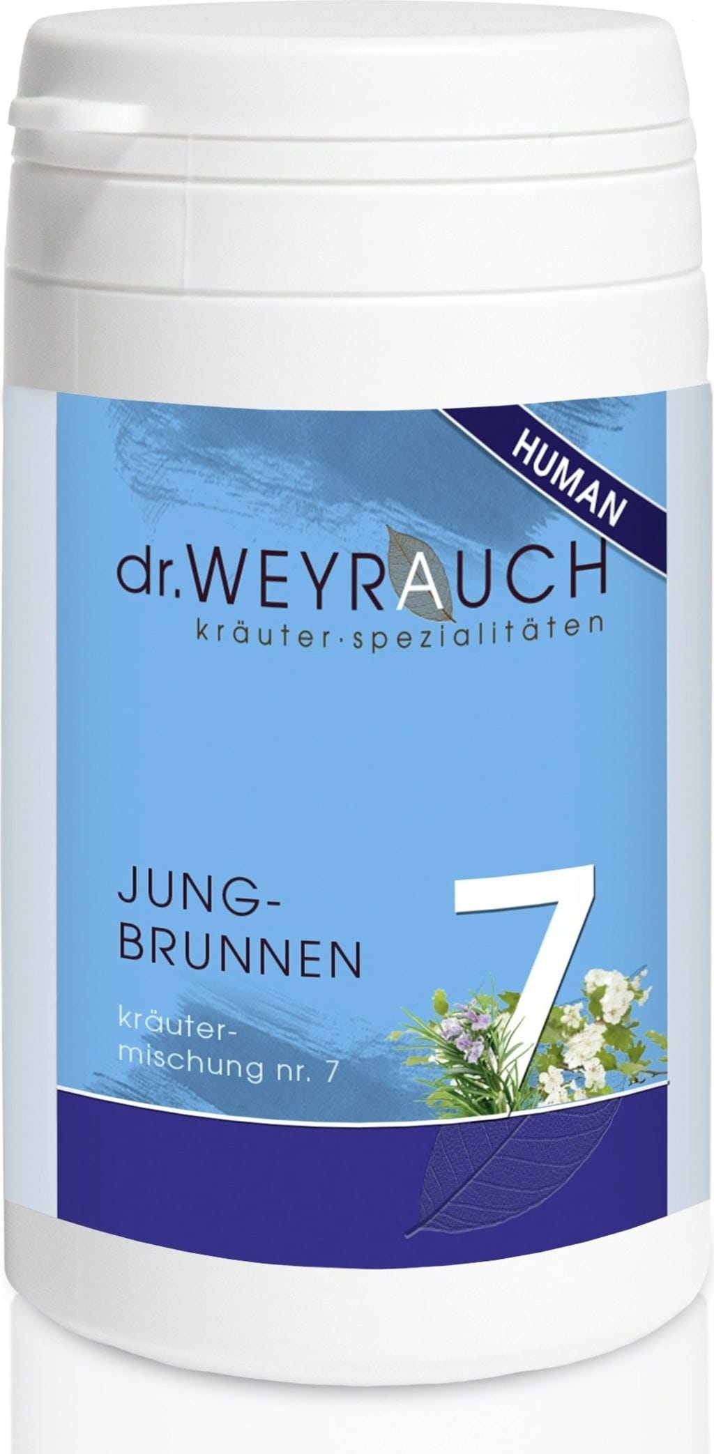 Nr. 7 Jungbrunnen Dr. Weyrauch jest oparty na cytrynianie magnezu. Oto magnez z głogu, galangalu, rozmarynu, miłorzębu i melisy. "Jungbrunnen" połączono z ekstraktem z zielonej herbaty, pestkami winogron i siemieniem lnianym. Recepturę uzupełniają proantocyjanidyny (OPC), katechiny (antocyjanidyny), kwercetyna i naturalna witamina E.