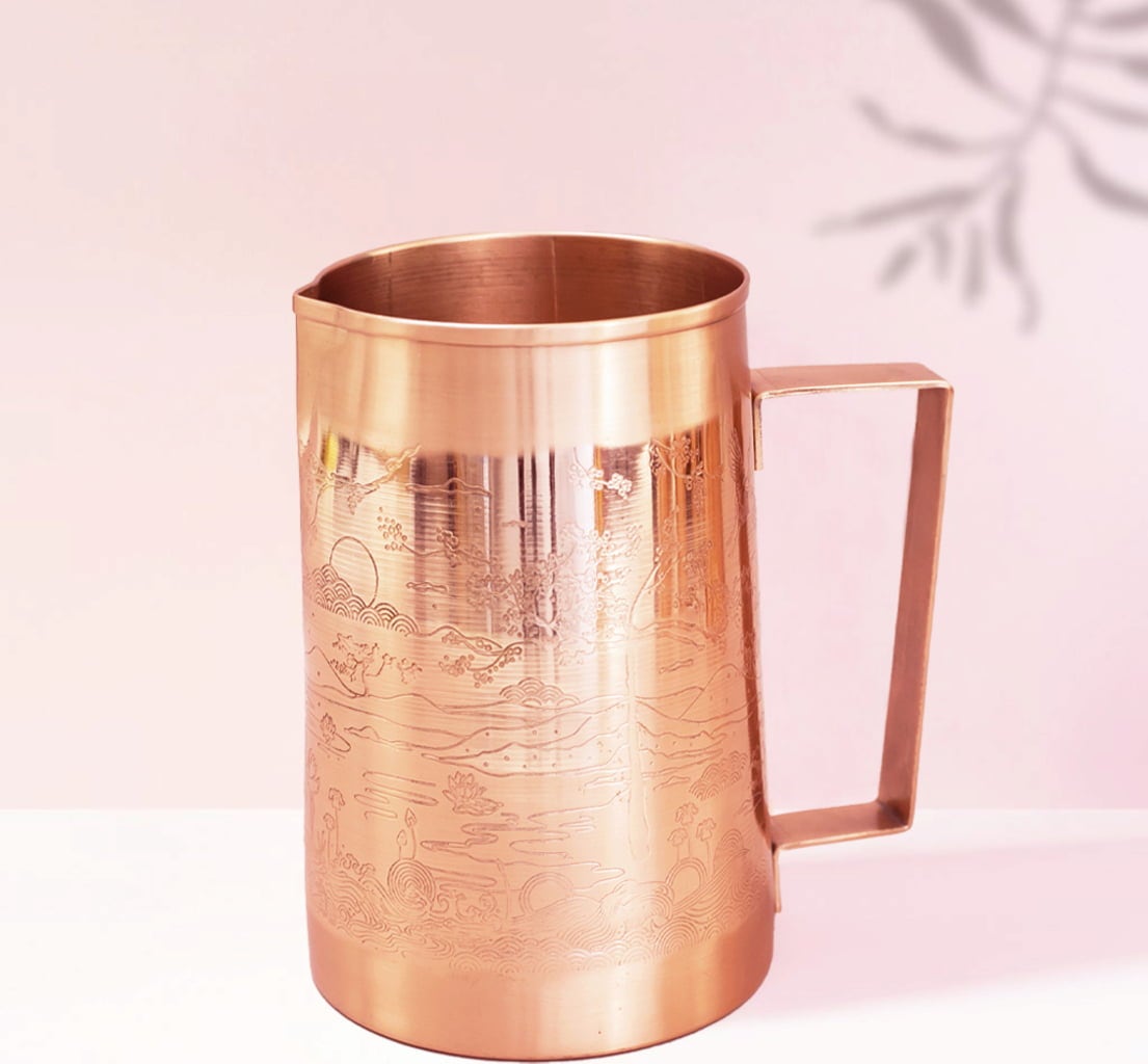 Ten miedziany dzbanek idealnie nadaje się do serwowania wody niegazowanej. Alternatywnie może zostać wykorzystany jako stylowy wazon na kwiaty. Dzbanek z bezpiecznej dla żywności miedzi zostaje ręcznie wykonany w Indiach i łączy nowoczesny wygląd z tradycyjnym rzemiosłem. Z zewnątrz dzbanek został pokryty lakierem dopuszczonym do kontaktu z żywnością. Wnętrze dzbanka jest pozostawione w naturalnej postaci, dzięki czemu dzbanek alkalizuje wodę.