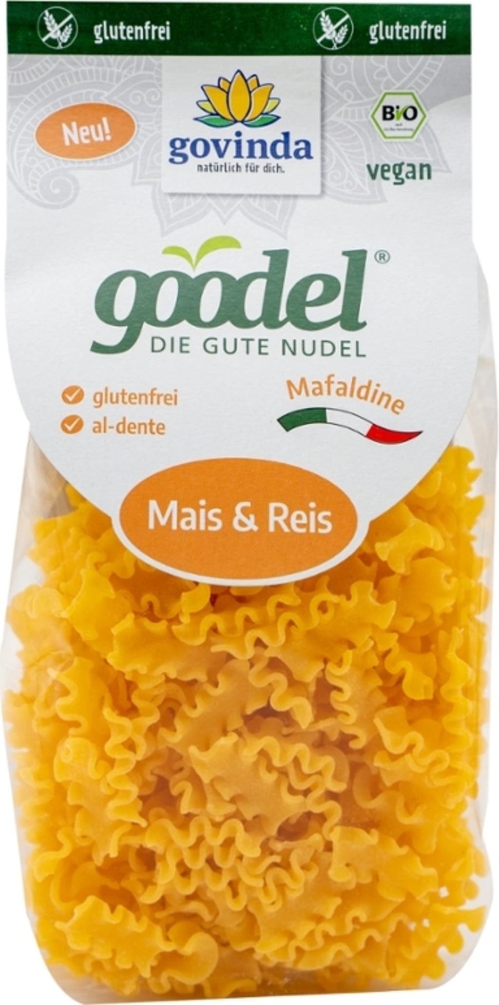 Goodel Mafaldine firmy Govinda wnosi autentyczny włoski smak makaronu do bezglutenowej kuchni. Wytwarzane z kukurydzy i ryżu w wyspecjalizowanej manufakturze ciasto jest delikatnie przetwarzane i suszone, aby zachować idealną konsystencję. Charakterystyczny falisty kształt Mafaldine szczególnie dobrze wchłania sosy i ma łagodny smak. Wysokiej jakości organiczna alternatywa dla każdego, kto ceni sobie najwyższej jakości składniki i staranne przetwarzanie.