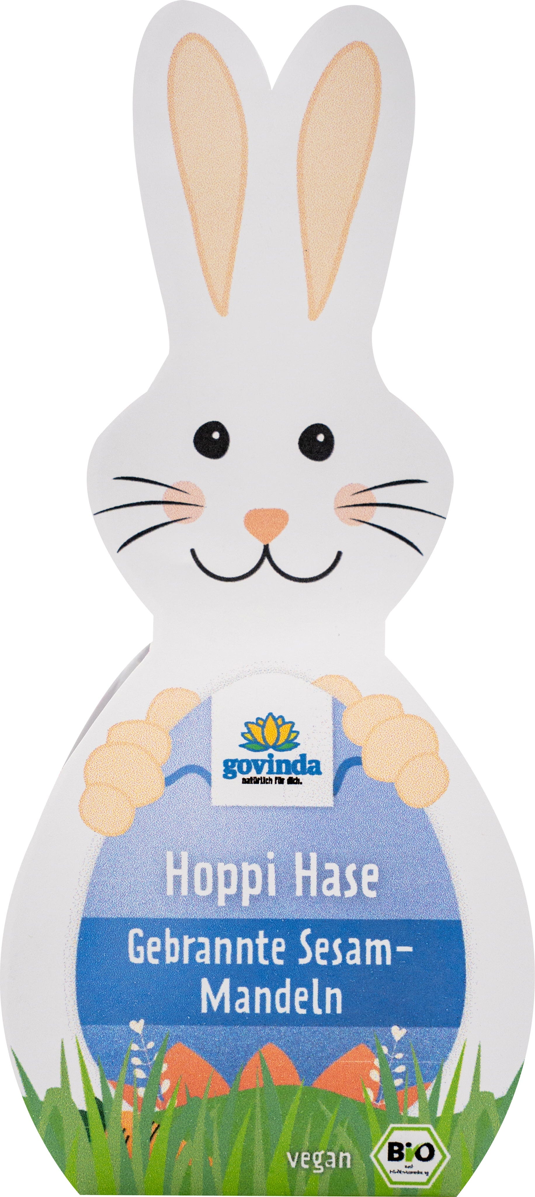Zając Hoppi od Govinda to wyjątkowe połączenie chrupiących, organicznych migdałów i orzechowego sezamu. W zakładzie Govinda składniki są prażone w miedzianych kotłach tradycyjnymi metodami, co pozwala zachować ich charakterystyczny aromat. Delikatna warstwa surowego cukru trzcinowego dopełnia ten w pełni roślinny, organiczny deser – idealny jako przemyślany dodatek do wielkanocnego koszyka.