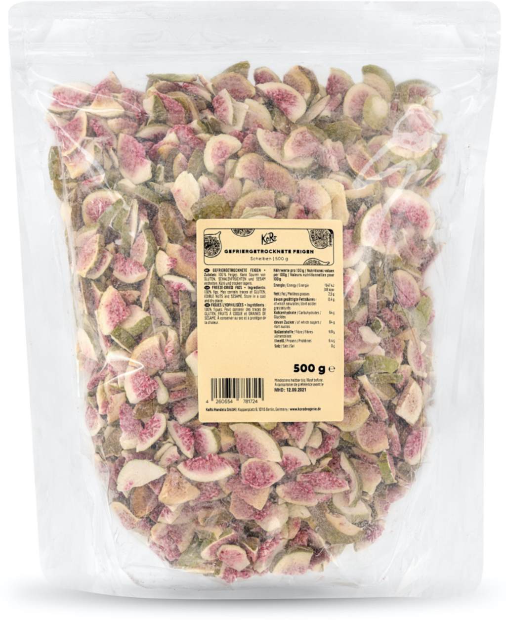 Liofilizowane figi w kawałkach od KoRo nie zawierają dodatku cukru i mają delikatnie słodki smak pochodzący tylko z owoców. Dzięki temu idealnie nadają się jako posypka do wielu deserów lub jako zdrowa przekąska na wieczór przed telewizorem.
