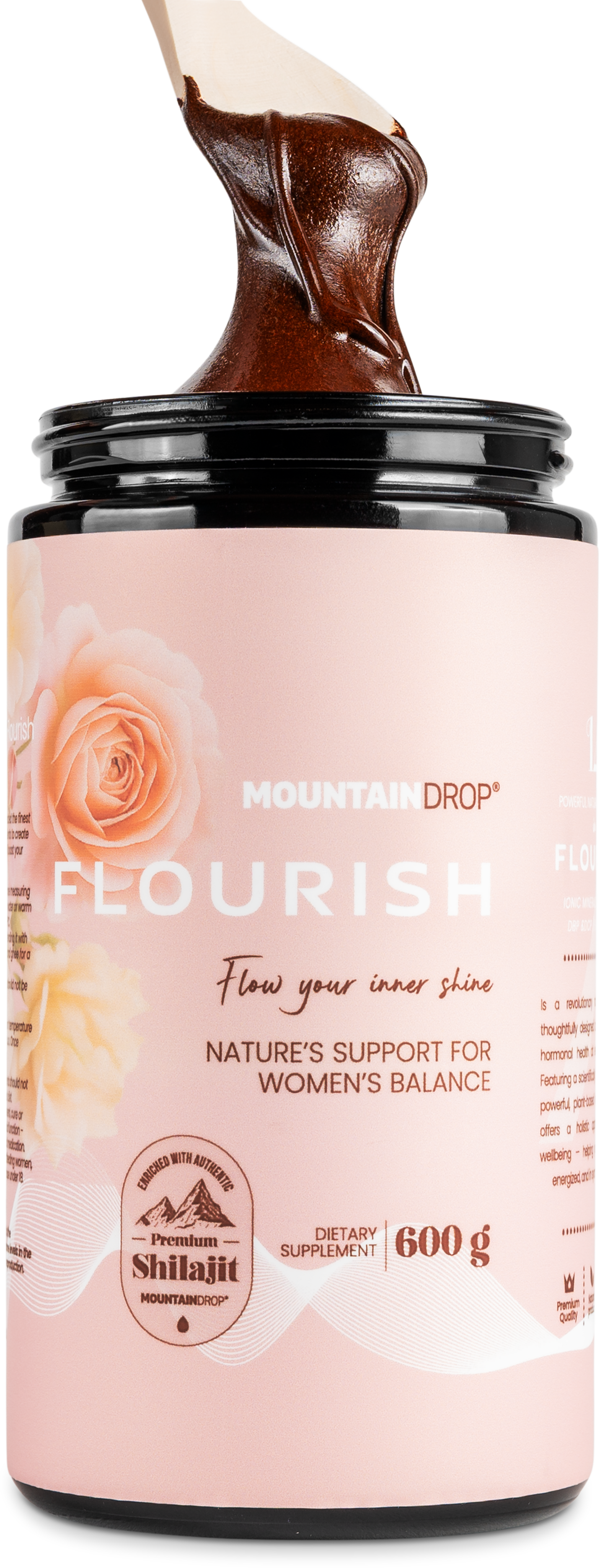 Flourish firmy Mountaindrop łączy najwyższej jakości shilajit z 13 specjalnie dobranymi składnikami w naturalnej bazie słoweńskiego miodu. Formuła opiera się na precyzyjnie zbilansowanej matrycy ashwagandhy KSM-66® i koreańskiego żeń-szenia, uzupełnionej tradycyjnie cenionymi ekstraktami ziołowymi, takimi jak shatavari, pieprz mnicha i czerwona koniczyna. Dopełnieniem mieszanki jest połączenie magnezu, cynku oraz witamin B6 i D3, które są harmonijnie osadzone w strukturze miodu. Delikatne przetwarzanie bez stresu termicznego zachowuje naturalne właściwości surowców w ich pierwotnej jakości.