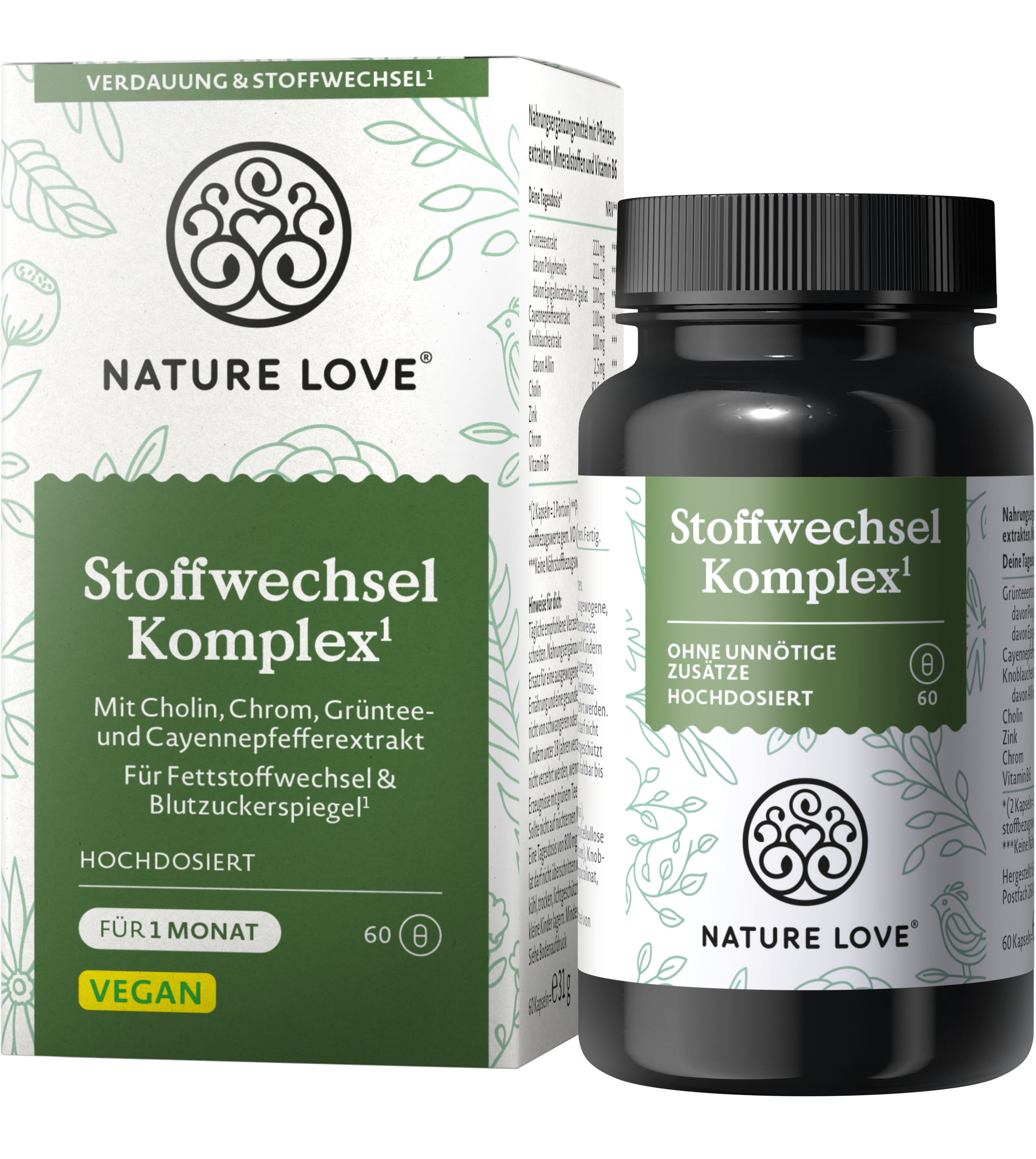 Kapsułki z kompleksem wspierającym metabolizm od Nature Love zawierają mieszankę zielonej herbaty, pieprzu cayenne, czosnku, cynku, chromu, choliny i witaminy B6. Nie zawierają dodatkowej kofeiny, aby uniknąć krótkotrwałego kofeinowego kopa. W 100% wegańskie i idealne do wspierania codziennego życia.