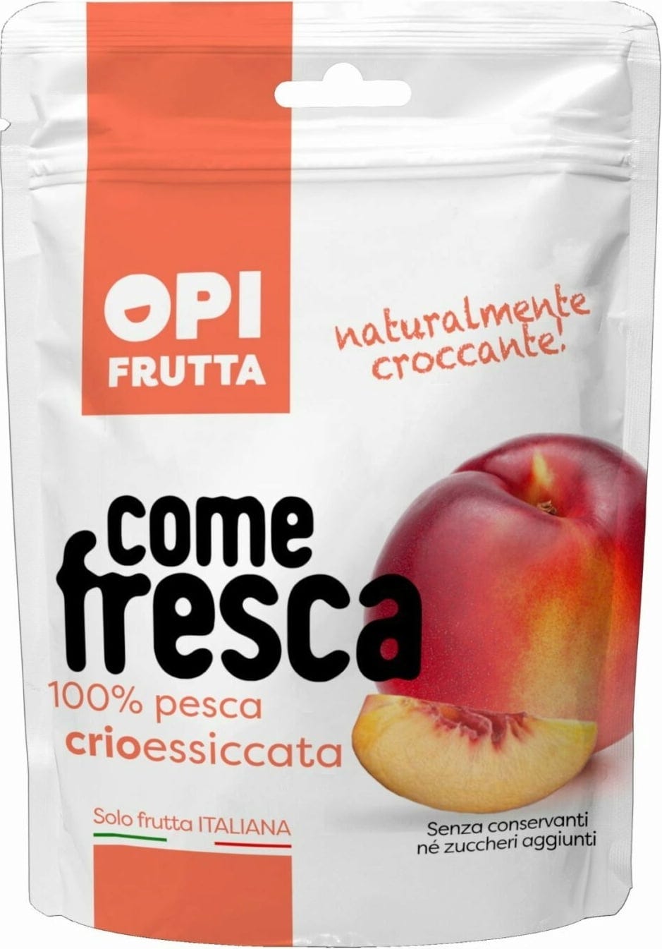 Słodkie, soczyste i pełne słonecznych smaków: liofilizowane plasterki brzoskwini OPI FRUTTA wprowadzają lato do Twojego pudełka z przekąskami - bez żadnych dodatków. Delikatne przetwarzanie pozwala zachować cenne witaminy i minerały.