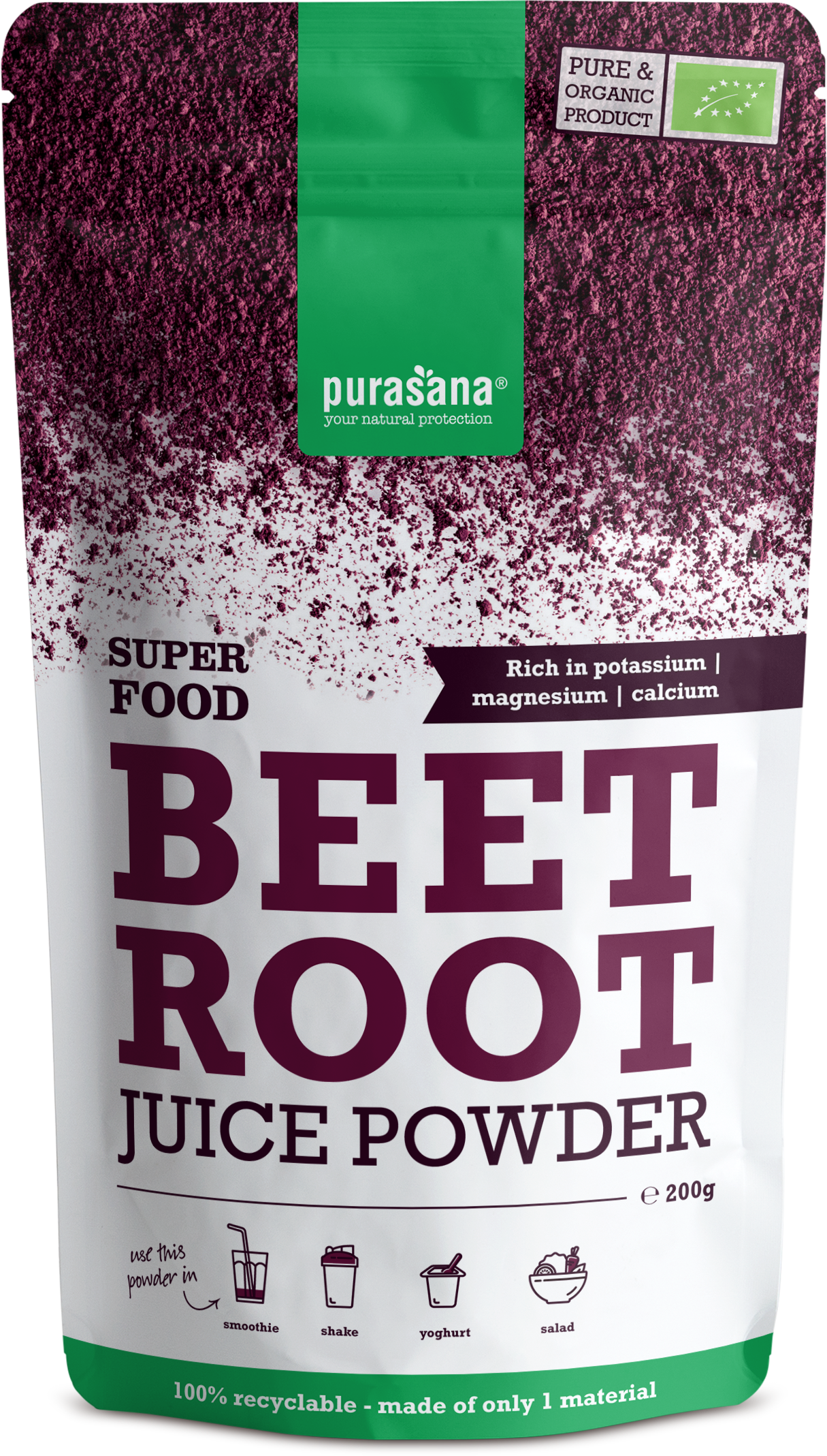 Organiczny proszek z czerwonych buraków jest uzyskiwany z soku dojrzałych czerwonych buraków. Buraki są bardzo odżywcze, zawierają wiele błonnika i są bogate w witaminy A, B i C, zawierają potas, magnez i żelazo. Proszek firmy Purasana może być spożywany przez wszystkich, którzy chcą poprawić swoje właściwości zdrowotne, jest on także popularny wśród sportowców wytrzymałościowych.