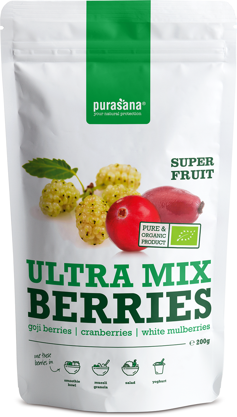 Organiczna mieszanka jagód firmy purasana składa się z suszonych jagód Goji (Lycium Barbarum), suszonej i słodkiej żurawiny oraz białej morwy (Morus alba).