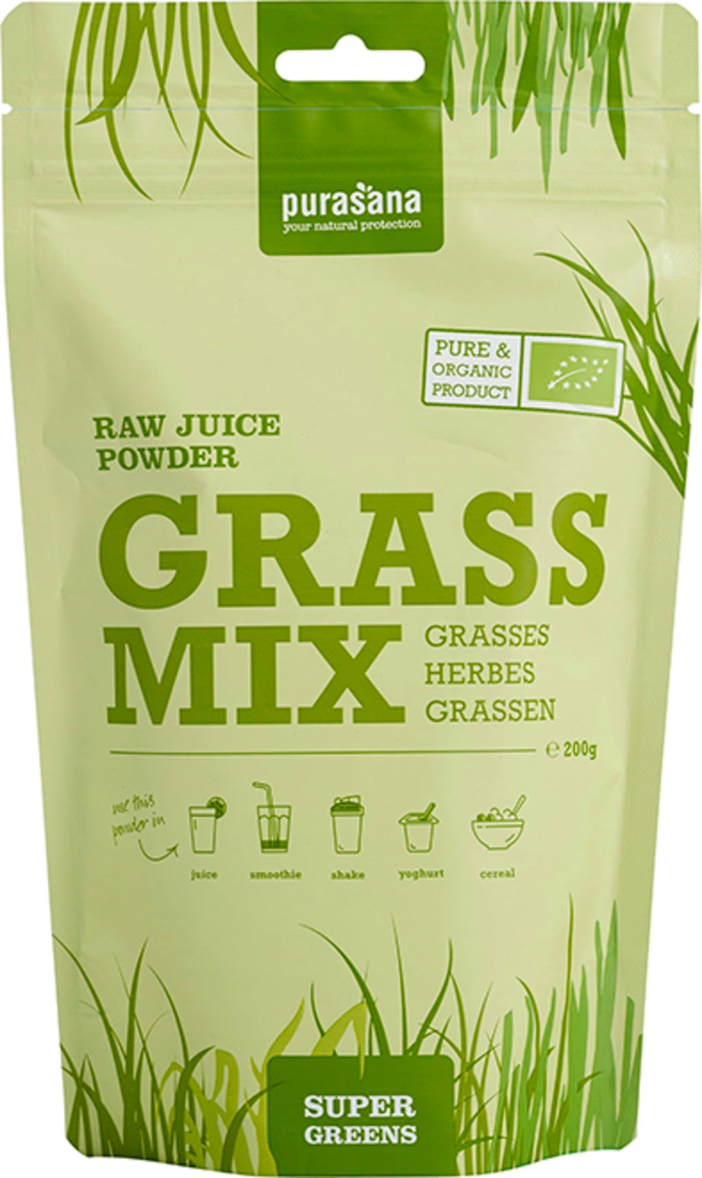 Proszek do soków Grass Mix Bio to mieszanka soku z trawy jęczmiennej, soku z trawy pszenicznej, soku z lucerny, soku z kamutów i soku z trawy owsianej. Stosowane pędy są prasowane na zimno bezpośrednio po zebraniu i przetwarzane w wysokiej jakości soki w proszku. Wystarczy wymieszać proszek z sokami, smoothie, shake'ami, jogurtami i muesli.
