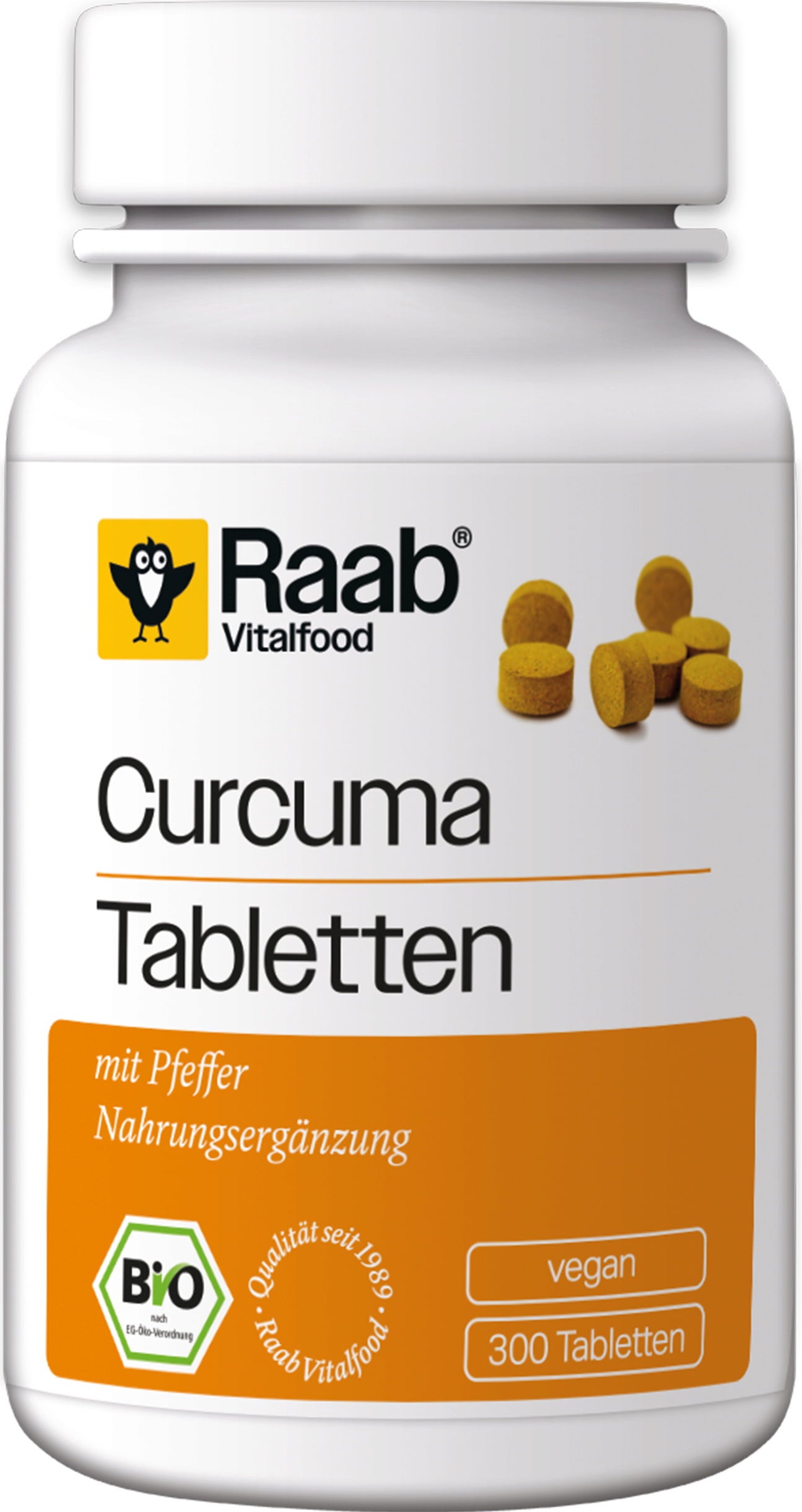 Wegańskie tabletki z kurkumą Raab Vitalfood naturalnie zawierają fitochemiczną kurkuminę i są produkowane w Niemczech. Tabletki zawierają również piperynę z pieprzu.