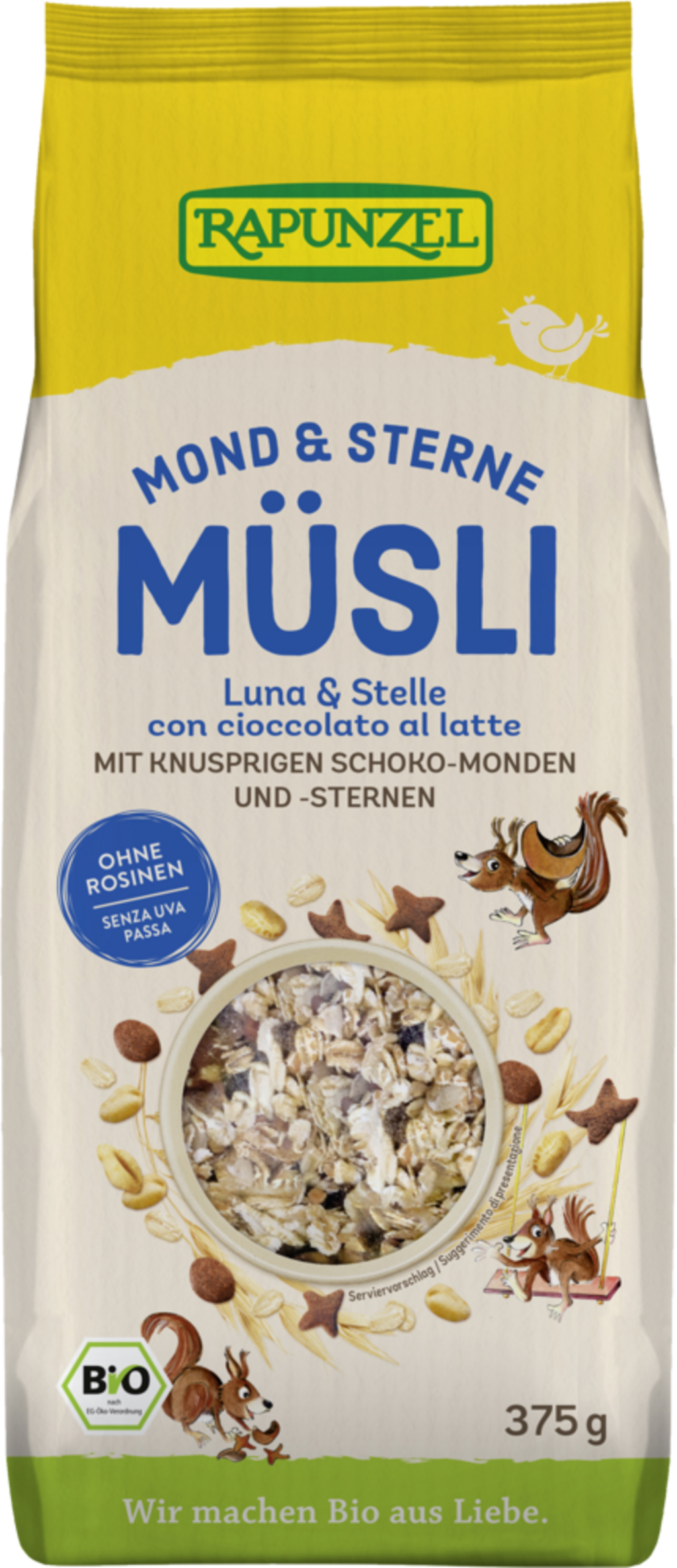 Puszyste księżyce i gwiazdki z chrupiącej czekolady, pożywne płatki zbożowe, płatki pełnoziarniste i słodkie wiórki z pełnej mlecznej czekolady sprawiają, że to musli jest hitem śniadaniowym dla dzieci i wszystkich młodych duchem! Idealny również do mieszania ze świeżymi owocami, jogurtem lub wegańskimi alternatywami mleka krowiego. Ziarna, których wykorzystano do produkcji tego musli, pochodzą z niemieckich upraw ekologicznych.