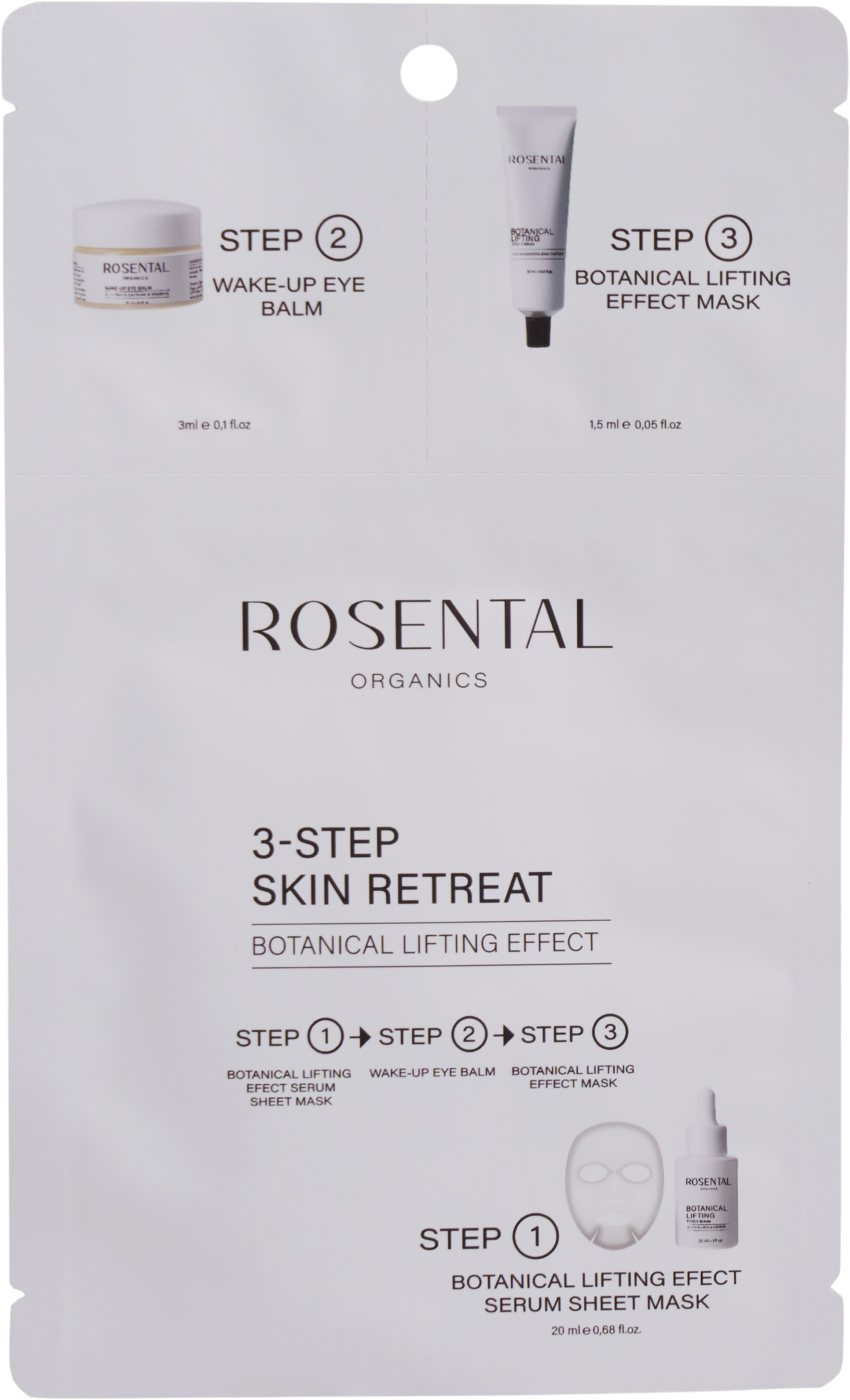 Dzięki tej trzystopniowej intensywnej pielęgnacji masz w swoich rękach ekskluzywny, jednorazowy zabieg o maksymalnym działaniu. Jako intensywny zabieg upiększający jest idealny w podróży lub do zapoznania się z bestsellerami Rosental. Saszetka zawiera trzy produkty, które działają synergicznie, zapewniając gładszą skórę, rozbudzone oczy i efekt liftingu.