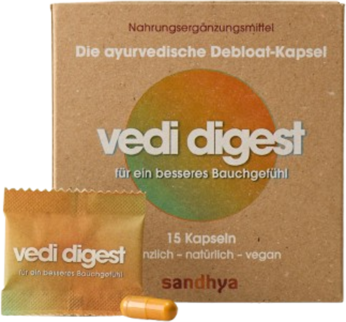 Wegańskie kapsułki vedi digest firmy Sandhya można przyjmować codziennie po posiłkach w celu uzyskania wsparcia. Ich ajurwedyjska formuła zawiera 7 wysokiej jakości substancji roślinnych bez pestycydów, w tym goryczkę, kardamon i liść gorzkiej koniczyny.