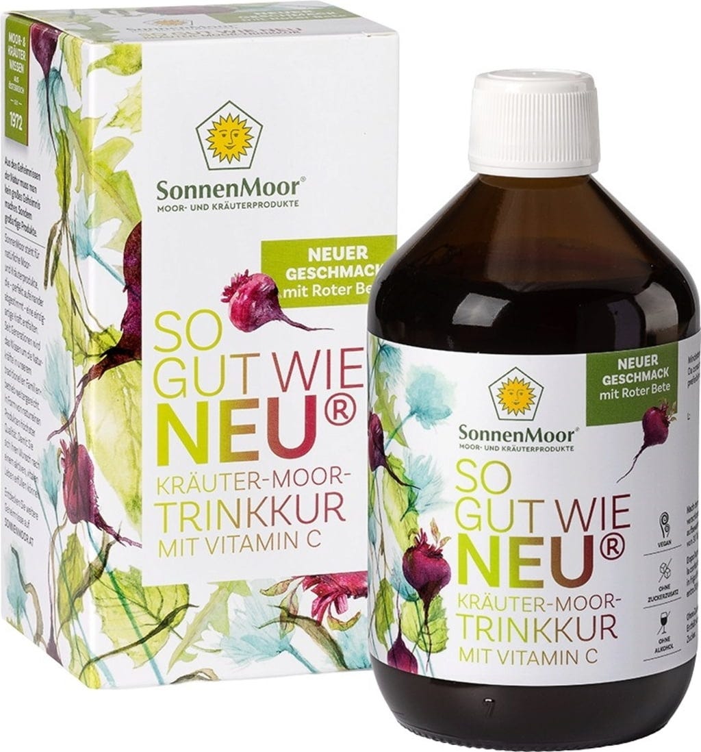 Produkt "Jak nowy" z burakiem to intensywny koncentrat ziołowy austriackiej firmy rodzinnej SonnenMoor. Formuła łączy w sobie właściwości 14 różnych roślin, takich jak korzeń mniszka lekarskiego, liście brzozy, pokrzywa i karczoch z naturalnymi składnikami torfowiska. Ta płynna mieszanka jest uzupełniona proszkiem z buraków i proszkiem z aceroli, który służy jako naturalne źródło witaminy C. Witamina C pomaga chronić komórki przed stresem oksydacyjnym i wspiera prawidłowy metabolizm energetyczny.