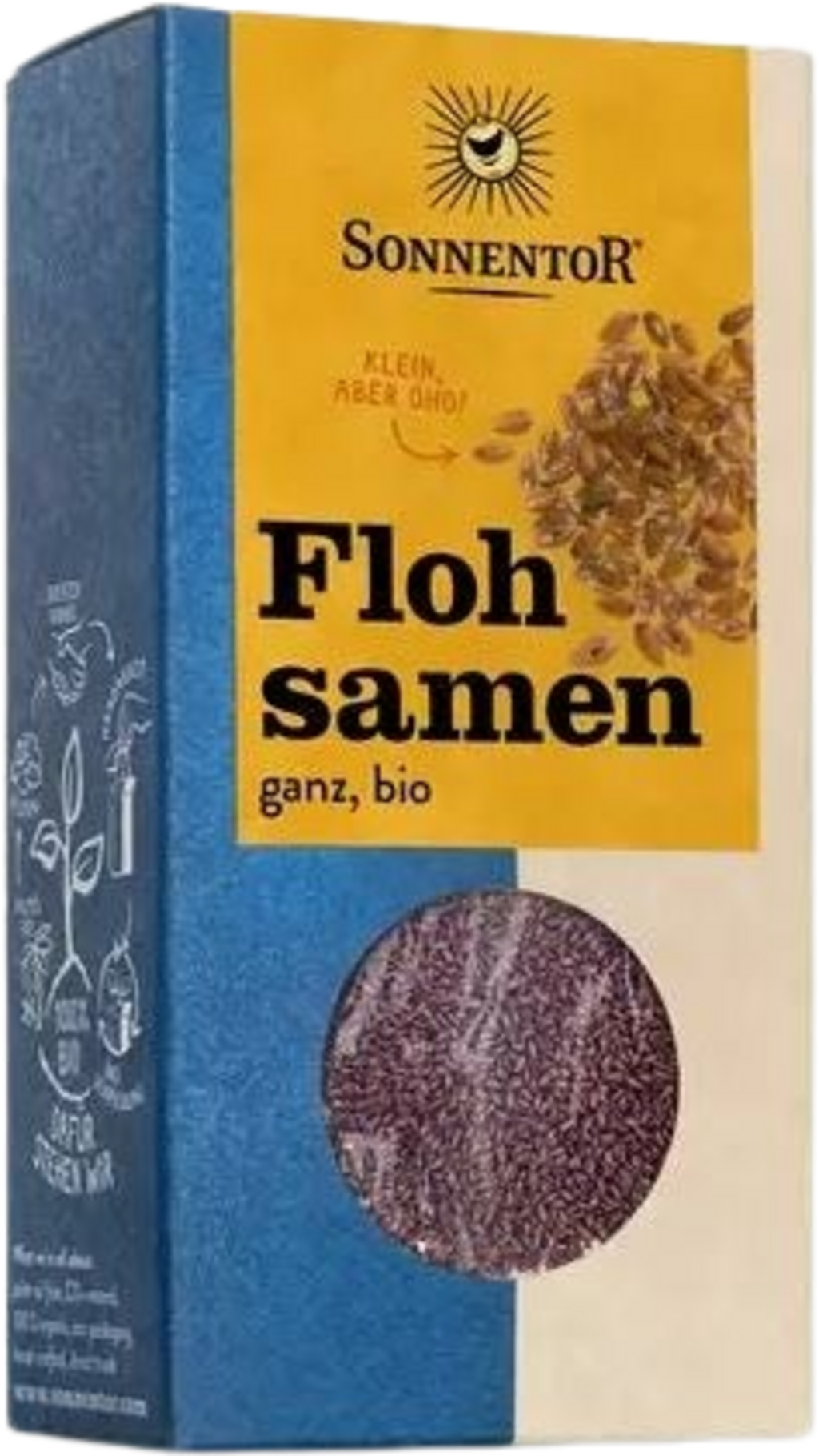 Sonnentor stosuje czarne nasiona psyllium, które są dojrzałymi nasionami babki (roślina). Po prostu namoczyć 1-2 łyżeczki nasion babki i zjeść z dużą ilością płynów lub jogurtem, musli itd. Brzuch na pewno się ucieszy! Wspaniale nadają się do zastosowania jako składnik do pieczenia oraz stanowi wspaniałą posypkę na pieczywie.