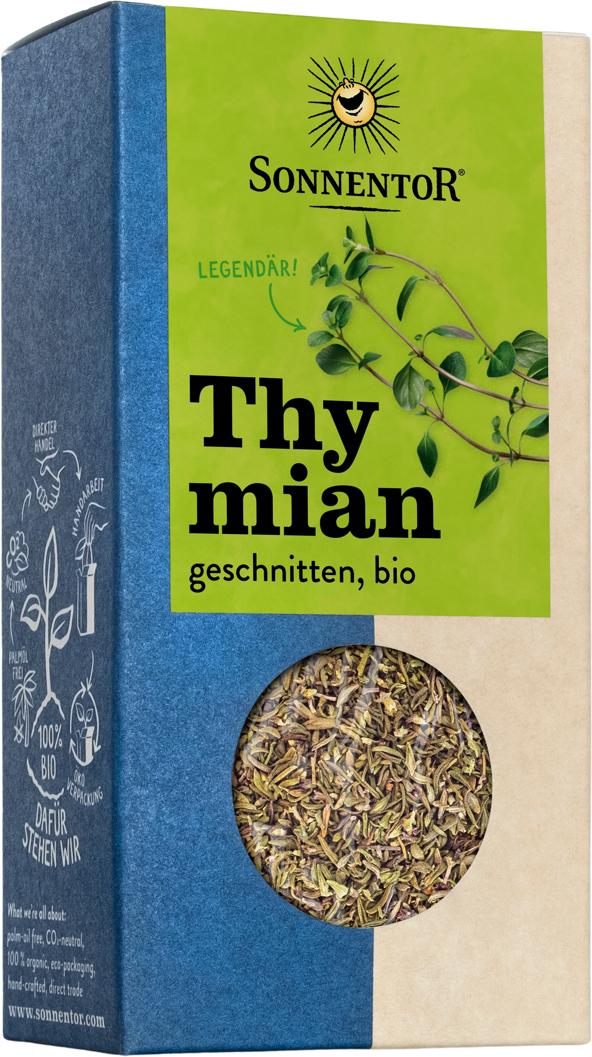 Ziemisty- pieprzny smak ma nuty anyżu, mięty i kamfory oraz nadaje śródziemnomorskim potrawom ich charakter. Tymian harmonizuje się dobrze z cebula, winem i piwem. Ten intensywny eteryczny zapach z powiewem igieł sosny przypomina region śródziemnomorski. Także mięta jest wspaniałym uzupełnieniem tego świeżego smaku.