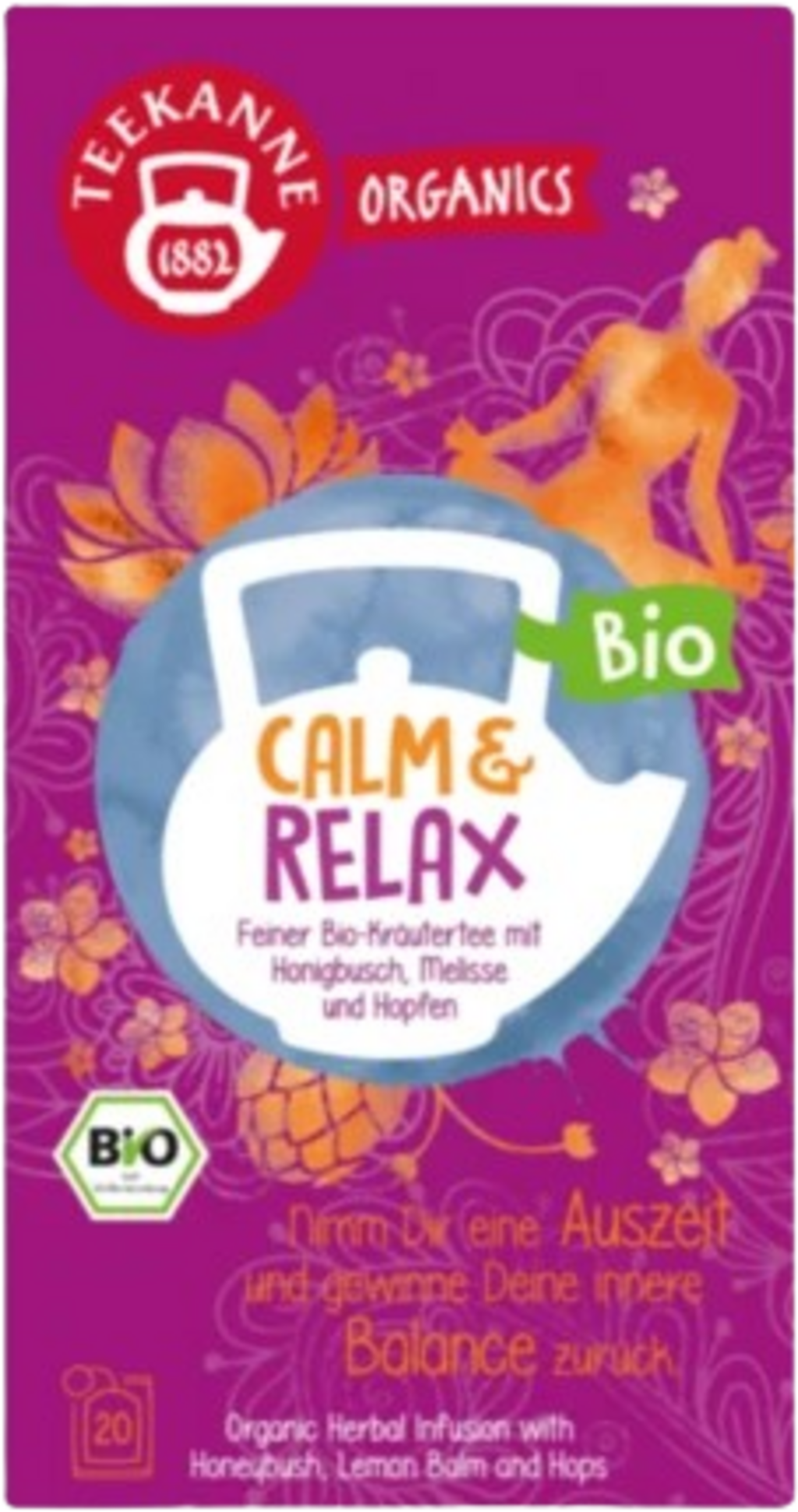 Kiedy codzienne życie znów jest szczególnie stresujące, nie wiesz, co robić najpierw, a Twoje myśli krążą jak karuzela: świadomie powiedz sobie „STOP” i zrób krótką przerwę z TEEKANNE Organics Calm & Relax! Mieszanka herbat z relaksującymi organicznymi ziołami, tj. chmiel, melisa i trawa cytrynowa uspokaja i jednocześnie dodaje siły. Lukrecja, honeybush i słodkie liście jeżyny nadają herbacie subtelną, naturalną słodycz. Znajdź swój środek i staw czoła wyzwaniom!